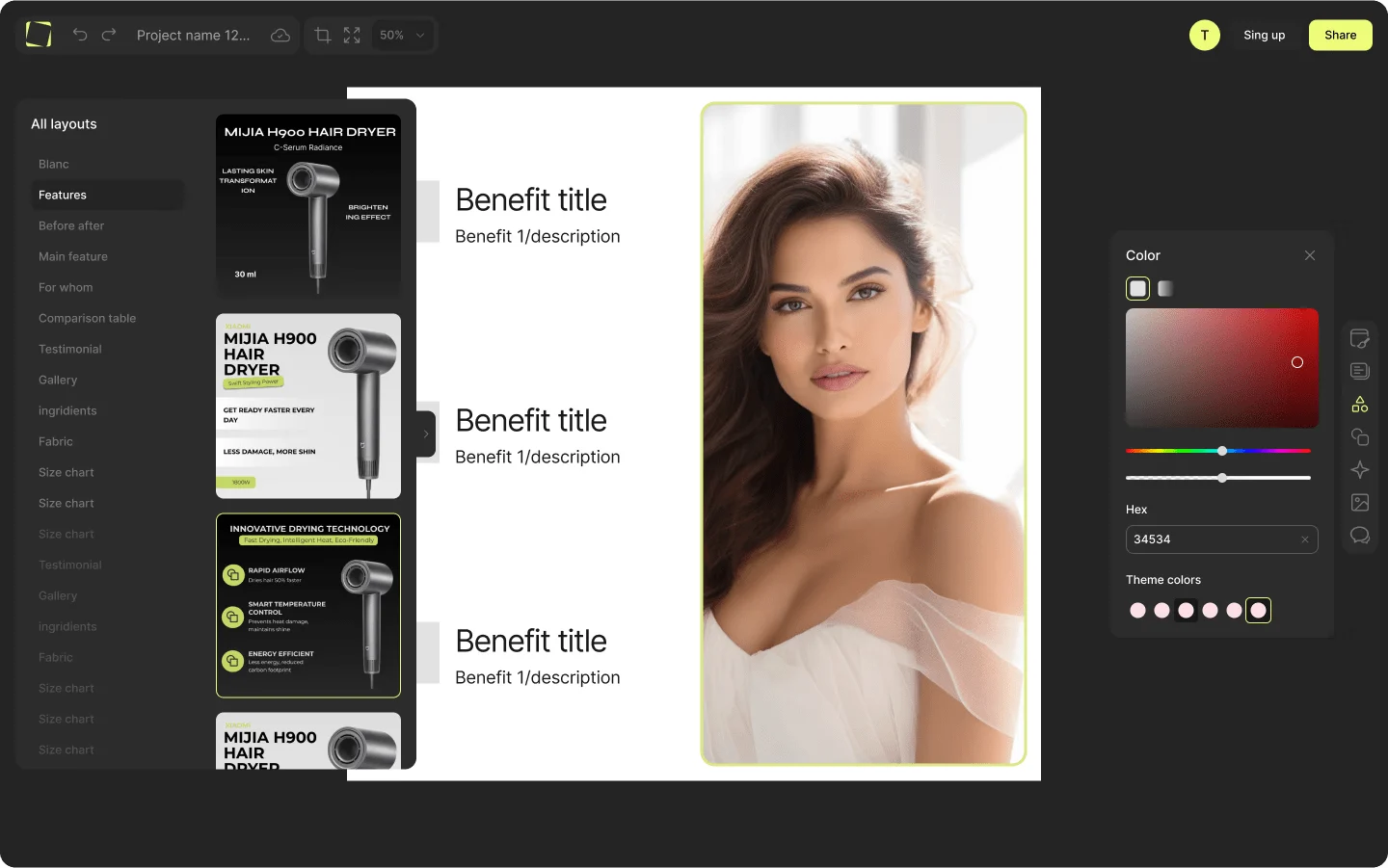 Здесь происходит вся работа с фото – добавление графики, текста, генерация изображений и пр. По сути, мини-фотошоп в онлайне. Преимущество редактора в том, что он позволяет создать серию изменяемых шаблонов. Селлер может сгенерировать готовые шаблоны со своим товаром, скорректировать графику и текста, выгрузить всё и добавить на маркетплейс или в соц.сети.